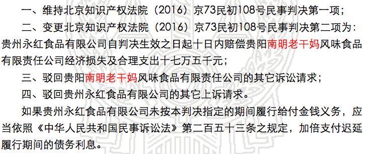 今年5月16日,北京高院作出终审判决,对于贵州永红侵犯贵州老干妈商标行为认可,但仍未支持贵州老干妈经济损失赔偿的请求,并且重新核定贵州老干妈诉讼合理支出费用,变更一审判赔额为17.5万元,驳回双方其他上诉请求。