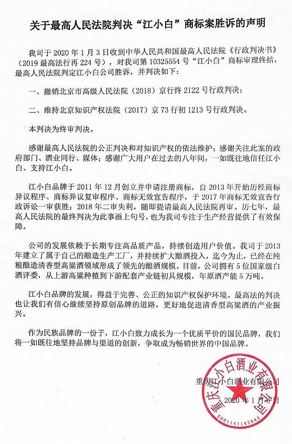 1月6日,江小白公司发布声明称,最高人民法院对“江小白”商标审理终结,判定江小白公司胜诉。声明指出,公司在2013年开始历经商标异议,在2017年的一审中获胜,但在2018年的二审败诉,随即提请到最高人民法院再审,最终于1月3日收到了胜诉判决。